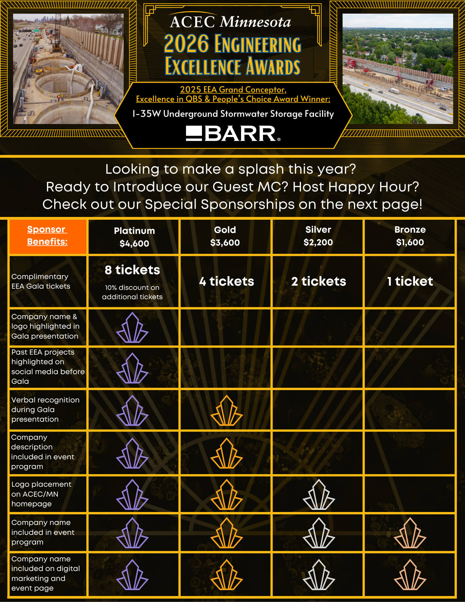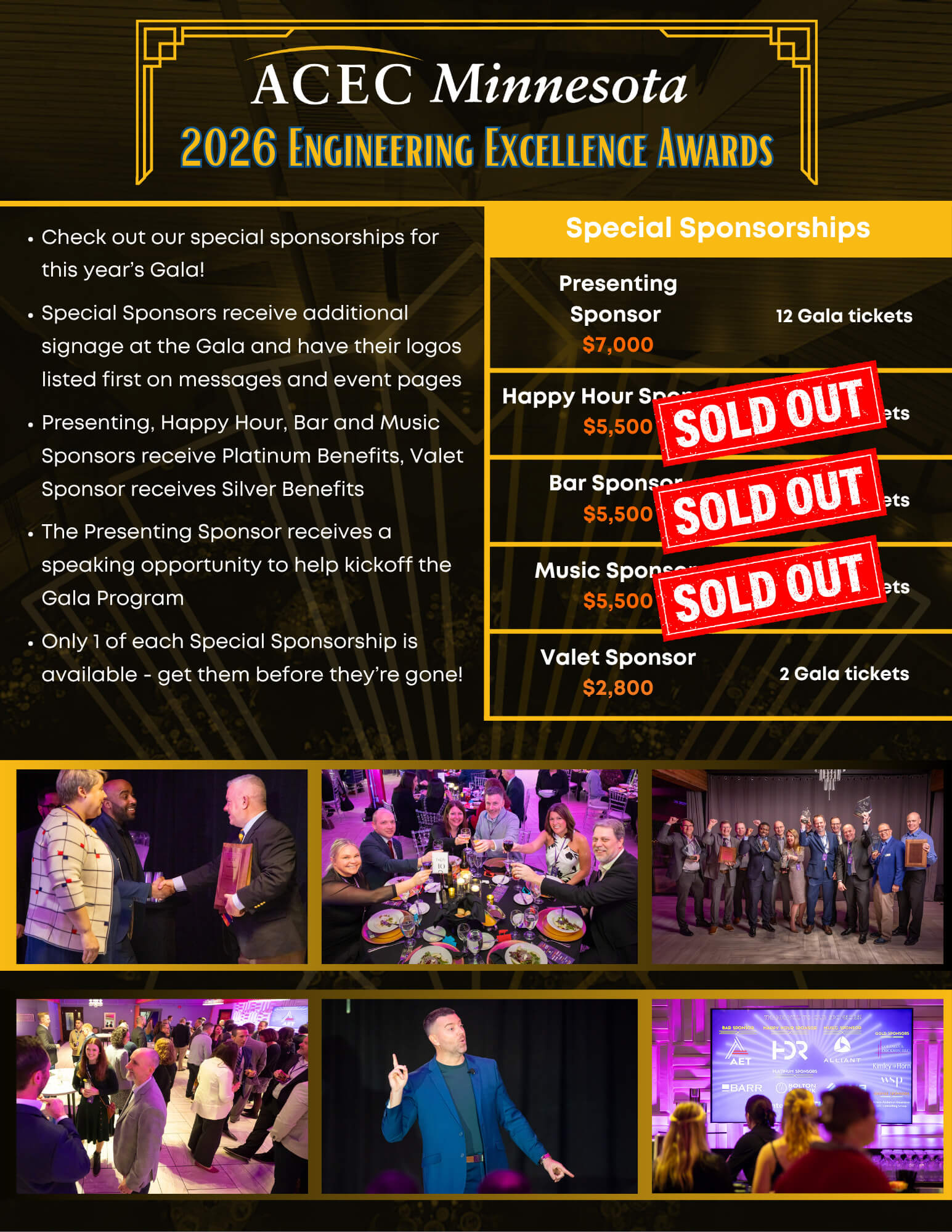 Sponsorships for 2026 EEA Gala Date and Time Friday Feb 6, 2026 Fees/Admission See our Sponsorship charts below for details on pricing and benefits. Only one of each special sponsorship is available, and they are sold on a "first come, first serve" basis. If you would like to be invoiced for a sponsorship, please reach out to kelly@acecmn.org or john@acecmn.org. Sponsorships for 2026 EEA Gala Set a Reminder Enter your email address below to receive a reminder message. Email address Select the amount of Days before the event -- Select Days Before Event -- 1 Day 2 Days 3 Days 1 Week Captcha Validation Please complete the Captcha Submit Description Set a Reminder Enter your email address below to receive a reminder message. Email address Select the amount of Days before the event -- Select Days Before Event -- 1 Day 2 Days 3 Days 1 Week Captcha Validation Please complete the Captcha Submit Share × Print Email Add to Calendar Facebook Twitter LinkedIn Tell a Friend × Select Calendar Type × Google Yahoo iCal (Outlook, Apple, or other)